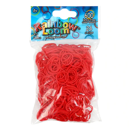 Each pack of Rainbow Loom Elastics have 600 pieces of latex free rubber bands and 24 C-clips. The C-clips are used for joining both ends of the bracelet. Each pack can make 24 single patterned bracelets.